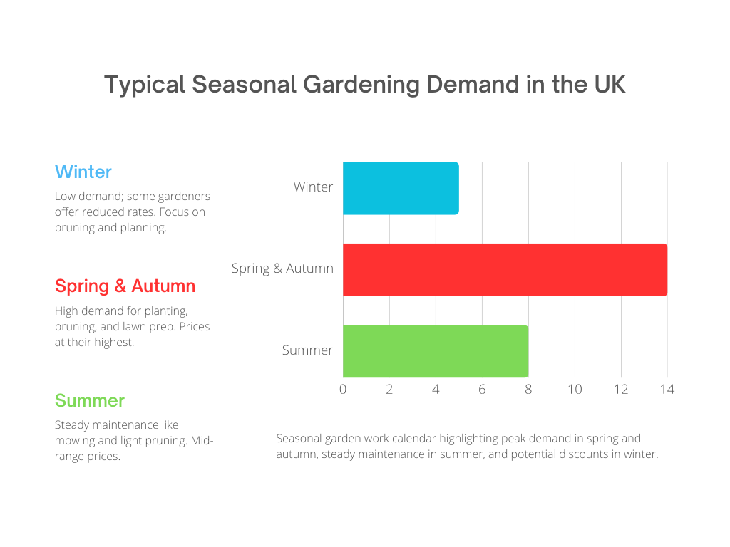 Garden services experience significant seasonal demand fluctuations affecting pricing throughout the year, with spring and autumn representing peak periods for most garden maintenance work.